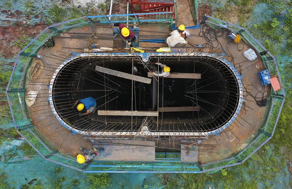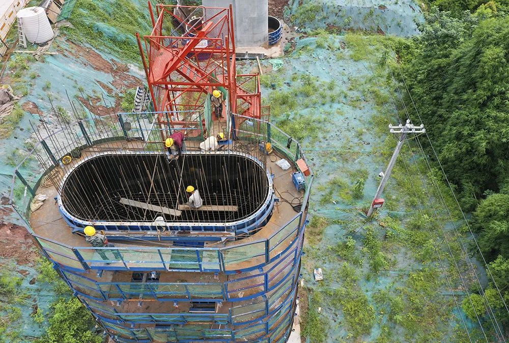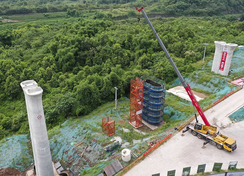 ▲9月8日拍摄的渝昆高铁川渝段站前一标三百梯水库特大桥施工作业现场(无人机照片)。