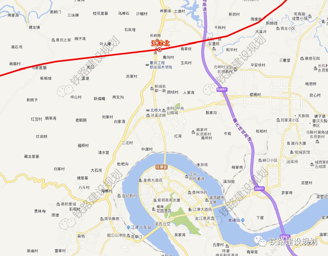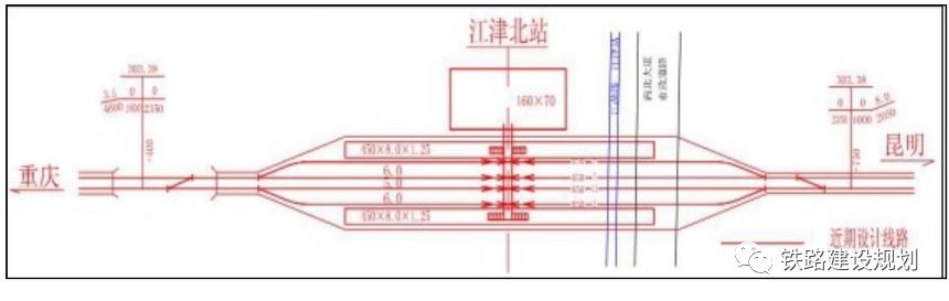 江津北站位于江津区北侧约6公里的滨江新城重庆工程职业技术学院东北侧。车站设到发线4条(含正线2条),设450m×8.0m×1.25m侧式站台2座,跨线设备1座。车站主体大部分在高架桥上,车站为平坡直线站,站房按线侧下式布置。