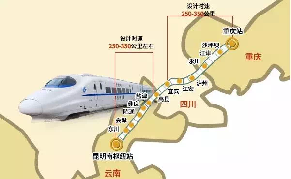 线路自重庆西站引出,经重庆市九龙坡(预留)、江津区、永川区,四川省泸州市、宜宾市,贵州省毕节市,云南省昭通市、曲靖市,终至昆明南站。