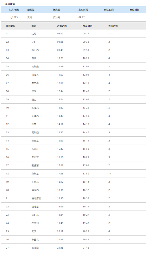 始发站为沈阳,终点站为长沙