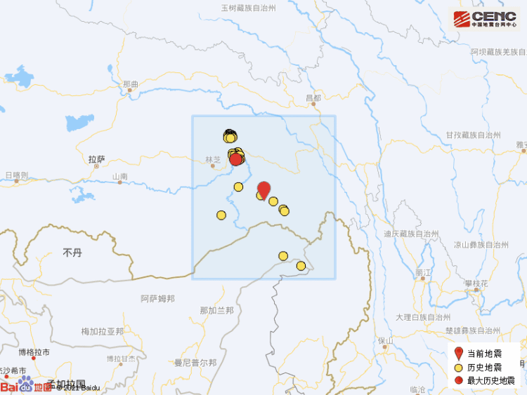 历史地震: 根据中国地震台网速报目录,震中周边200公里内近5年来发生3级以上地震共94次,最大地震是2017年11月18日在西藏林芝市米林县发生的6.9级地震(距离本次震中121公里),按震级大小前50次历史地震分布如图。