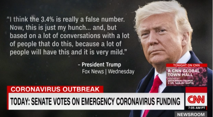 而在世界卫生组织总干事谭德赛表示新冠病毒全球致死率约为3.4%后,特朗普对福克斯新闻说:“好吧,我认为3.4%真得是个错误的数字。这只是我的直觉,而且基于与很多从事这方面工作的人的大量沟通,因为很多人可能会感染病毒,但症状非常轻微。”