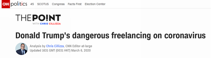 尽管特朗普的访问最终成行,但美国有线电视新闻网(CNN)6日刊登的一篇由该媒体资深编辑克里斯·西莉扎(Chris Cillizza)撰写的观点文章认为,白宫此前宣布取消特朗普行程称是“因为他们不想让疾控中心分心”,还后来根据特朗普的说法可能是“担心去CDC会让特朗普和他的白宫幕僚暴露在病毒之下”,这两种说法存在很大的不同。文章评论说,几乎每周特朗普在公开场合说的一些话,要么直接反驳,要么“挖他自己白宫的墙角”。文章进一步列举了最近特朗普在新冠病毒问题上与医学界专家、世界卫生组织等种种不同或是反驳性表态,认为特朗普总是“自由发挥”“很危险”。