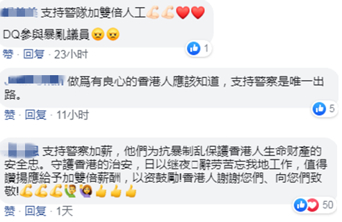 在网友的留言中,更多的是表示对港警的支持,“支持警队双倍加薪”,“作为有良心的香港人应该知道,支持警察是唯一出路。” ↓