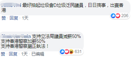 当时有网友表示,“垃圾泛民议员,日日搞事,出卖香港”;支持议员减薪50%,香港警察加薪50%。↓