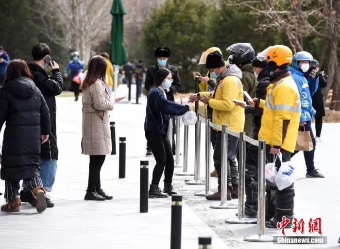 资料图:外卖送餐员等候订餐者前来取餐。中新社记者 侯宇 摄