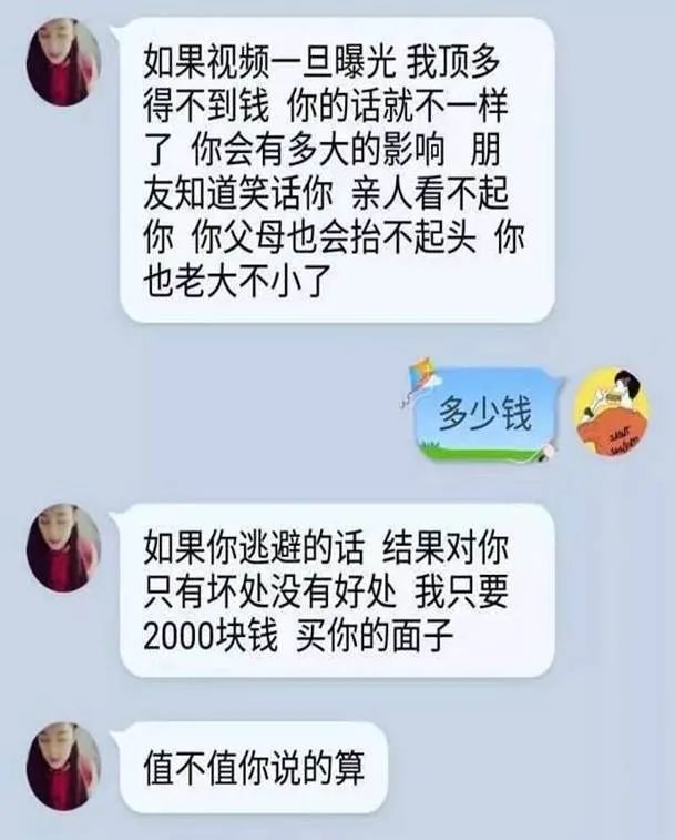 小王一下慌了神,通讯录里有他的领导、同事、家人!如果被群发了视频,后果他是难以承受的。好在999元还可以勉强接受,小王用颤抖的手向对方提供的支付宝账号转账999元。小王以为花钱就了事了,结果对方又说再发1999元删通讯录。小王转了1999元后,对方又说他只是业务员,老板说再发1999元,可是小王又转了1999元.......