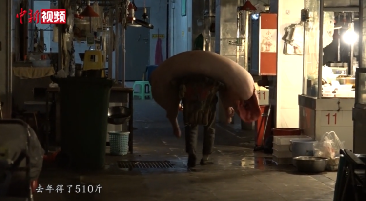 一位肉摊主说,“前几年,我拖来了约500斤重的猪肉,他一口气就将其从马路边背到了案板上。这几年,500来斤的猪少了,但重的也有460斤至480斤重,都是老朱背进来的。”