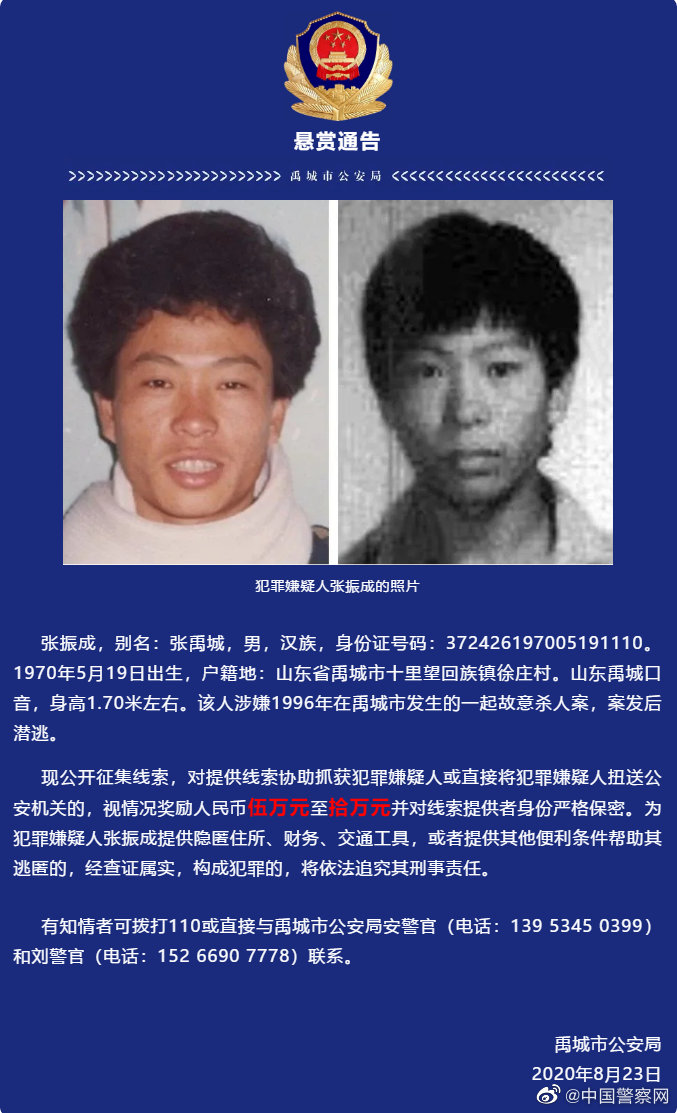 【最高奖励10万元!警方悬赏缉捕刑事案件在逃人员】张振成,别名:张禹城,男,汉族,身份证号码:372426197005191110。1970年5月19日出生,户籍地:山东省禹城市十里望回族镇徐庄村。山东禹城口音,身高1.70米左右。该人涉嫌1996年在禹城市发生的一起故意杀人案,案发后潜逃。