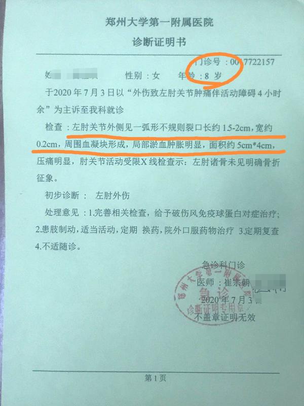 医院开具的诊断证明显示,3岁女童受惊吓后出现抽搐等局灶性癫痫;李淑贤老人为恶性肿瘤术后状态,诊断为被人殴打、踢、拧、咬或抓伤;8岁杨珍妮左胳膊外侧有不规则裂口,伴随局部淤血肿胀明显。杨先生的哥哥(楼上男主人)肚子、头顶、胳膊等多处受伤。