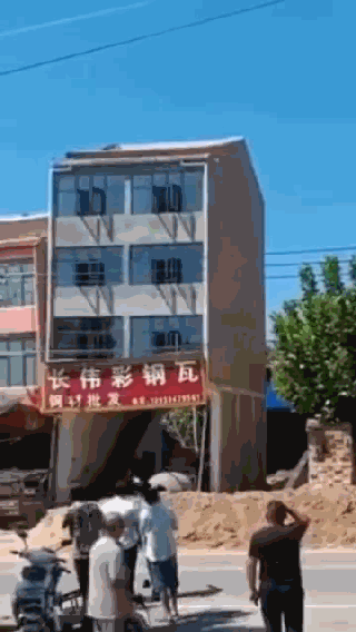 很多人已经围拢在摇摇欲坠的楼房前观看