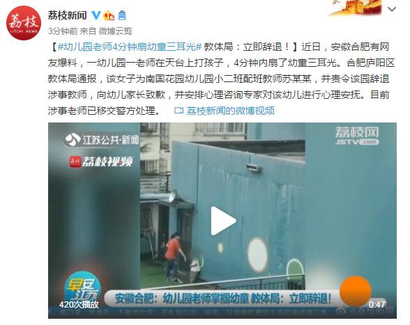 近日,安徽合肥有网友爆料,一幼儿园一老师在天台上打孩子,4分钟内扇了幼童三耳光。合肥庐阳区教体局通报,该女子为南国花园幼儿园小二班配班教师苏某某,并责令该园辞退涉事教师,向幼儿家长致歉,并安排心理咨询专家对该幼儿进行心理安抚。目前涉事老师已移交警方处理。