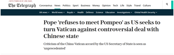 《每日电讯报》27日称,根据意大利《共和国报》报道,教皇办公室已经告诉美方外交官,因为担心被认为会影响即将到来的美国大选,教皇不会亲自接待蓬佩奥。然而《共和国报》解读称,这种冷落背后与蓬佩奥本月在一篇杂志文章中对中梵协议发出“强烈抨击”有关。