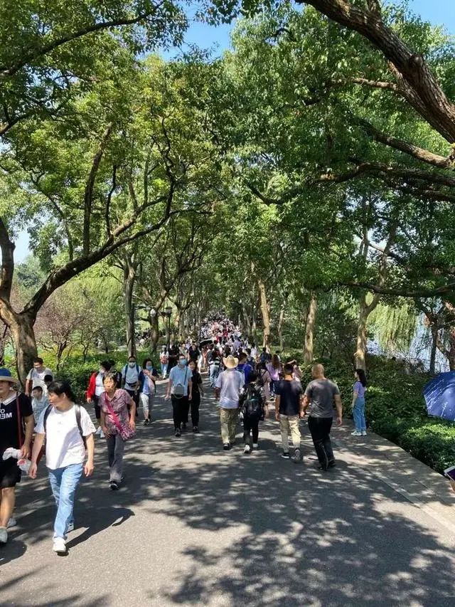 ▲国庆长假第2天,截至10月2日16时,杭州西湖风景名胜区各公园景点迎来市民游客45.74万人次 ,同比减少28.95 %;西溪国家湿地公园4.18万人次。(西湖边游人如织。陈馨懿 摄)