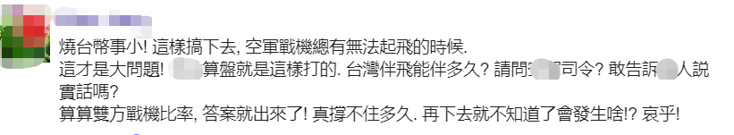 对此,有岛内网友留言称,烧台币事小,再这样搞下去, 台“空军”战机总有无法起飞的时候,这才是大问题。该网友还说,算算双方战机比率, 答案就出来了,台湾真撑不住多久。↓