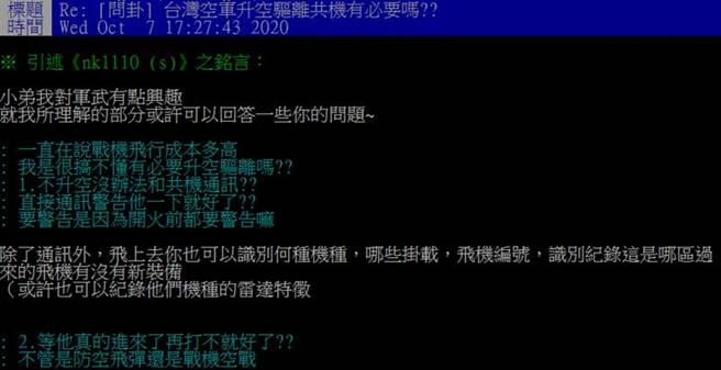报道称,该网友在岛内网友经常用的论坛PTT上好奇写下,“台湾空军不升空就没办法和共机通讯吗?直接通讯警告他一下就好了吧?”一名对军事有点兴趣的男网友回答了他的问题。这名网友说,升空除了通讯外,也可以识别解放军军机为何种机种、哪些挂载、飞机编号、识别记录这是哪区、过来的飞机有没有新装备。