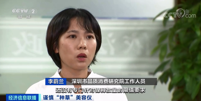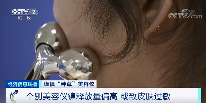 深圳市品质消费研究院工作人员 李蔚兰 :目前我国针对家用美容仪产品,还没有镍释放量的限值要求,所以这次比较试验参考了欧盟法规的相关,结果显示,10款家用美容仪产品的样品当中有6款就超出了限值要求。