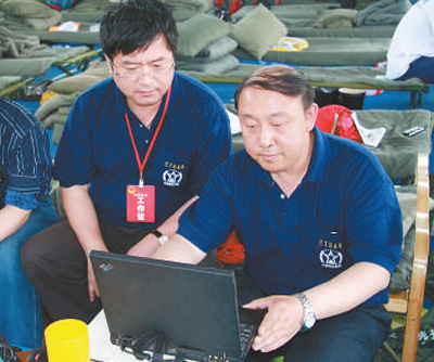 孙柏涛(右)和科考队员一起在整理地震灾害资料。