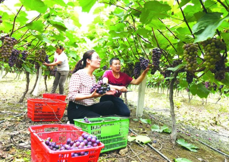 全国人大代表王萌萌(右二)带领村民种葡萄。(王萌萌供图)