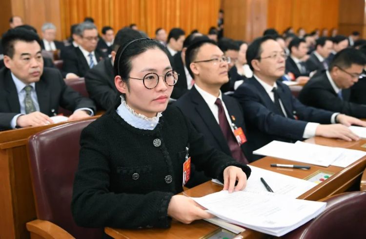 2019年3月8日,全国人大代表王萌萌(前左一)在十三届全国人大二次会议第二次全体会议上。摄影/新华社记者 杨宗友