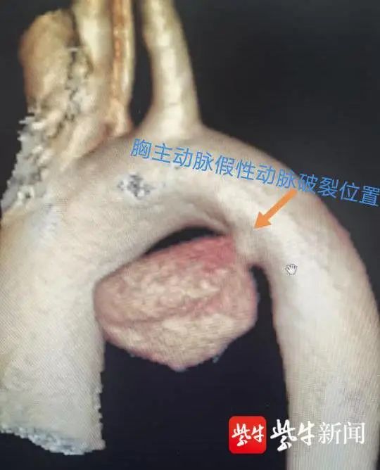 “当时在门诊上听了这个患者的描述,除了声音嘶哑为起病过程,并没有其他伴随症状,没有突发的胸腹部疼痛,血压、心率、体温都正常,但是检查主动脉CT成像后,我们发现他的胸主动脉弓下方有个血管瘤存在,结合病史,考虑为假性动脉瘤。 ”常州二院血管外科主任毛由军介绍道,“假性动脉瘤是胸腹主动脉夹层动脉瘤中的极为凶险一种,这类患者一般会有潜在的免疫系统疾病,由于疾病导致血管管壁异常,主动脉管壁会出现破裂口,血液随之溢出于血管腔外,由于血流溢出速度不是特别的快,就被周围组织包裹,形成瘤体样结构,因此称为假性动脉瘤。它仅靠一层很薄的血管外组织包裹着,一旦破裂,将立马因大出血而死亡。 ”