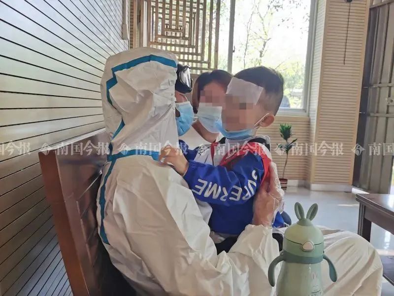 11月8日上午9点30分,计某穿着防护服,戴着防护镜、手套,准时出现在会见室。额头上还贴着退热帖的安安,见到爸爸就激动地跑了过去。计某坐在沙发上,将儿子抱起,放在自己的腿上。计某问安安:“在家听不听妈妈的话,有没有乖乖吃药?”说着说着,眼泪就开始在他的眼眶中打转,他不得不摘掉防护镜擦拭。