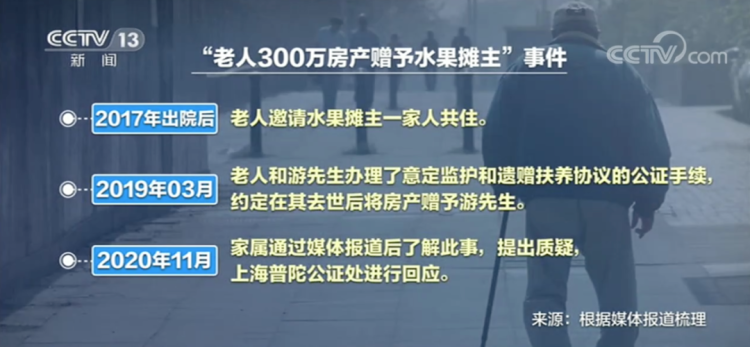2019年,老人带着游先生找到了上海市普陀公证处公证员李辰阳,做了两份公证:意定监护公证 指定水果摊主游先生作为自己的监护人;同时,“遗赠扶养协议 ”公证指定在其过世后将价值约300万的房产赠予非亲非故的游先生。