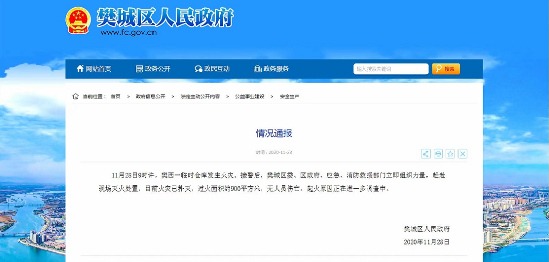 11月28日9时许,樊西一临时仓库发生火灾。接警后,樊城区委、区政府、应急、消防救援部门立即组织力量,赶赴现场灭火处置,目前火灾已扑灭,过火面积约900平方米,