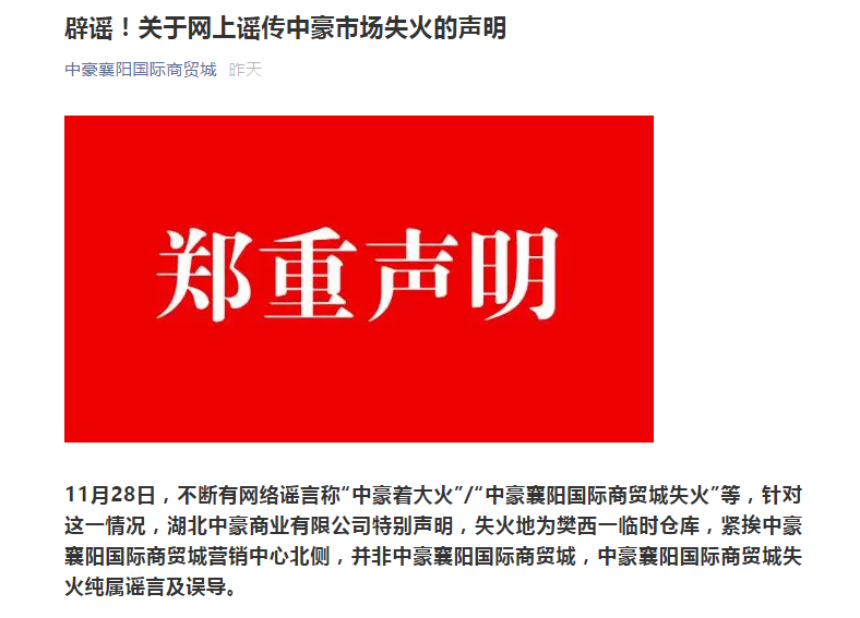 中豪襄阳国际商贸城失火纯属谣言及误导。