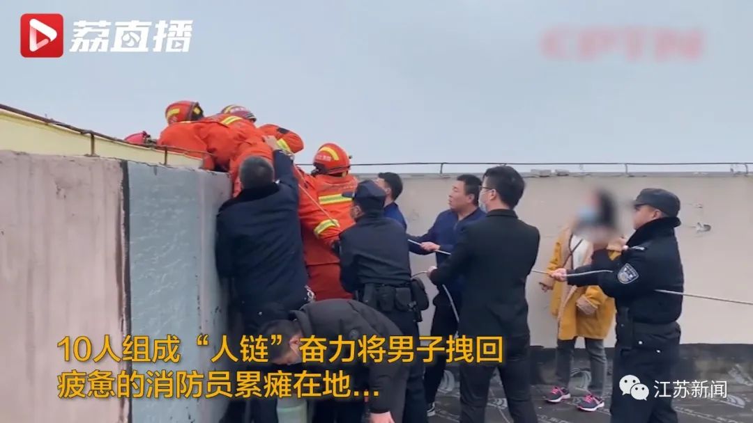 该男子被成功救下后,感谢了参与救援的消防员、民警和群众,而消防员也累瘫在地。