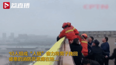 千钧一发之际,两名消防员第一时间飞奔过去抓住该男子的双手,出现了震撼一幕:三名消防救援人员紧紧拽着男子的手,两名民警拉着消防员们的腰带,几名群众在后面拉着保护绳 ,10人组成“人链”,合力把男子拉了上来,也把他从死亡边缘拉了回来。