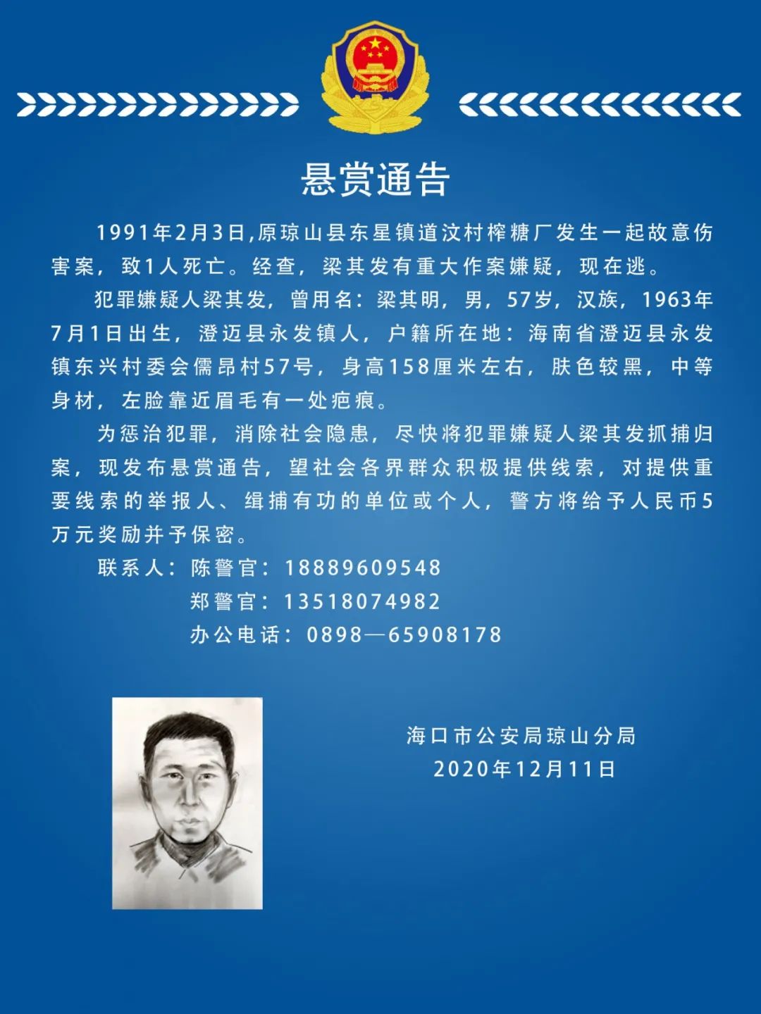 犯罪嫌疑人梁其发,曾用名:梁其明,男,57岁,汉族,1963年7月1日出生,澄迈县永发镇人,户籍所在地:海南省澄迈县永发镇东兴村委会儒昂村57号,身高158厘米左右,肤色较黑,中等身材,左脸靠近眉毛有一处疤痕。