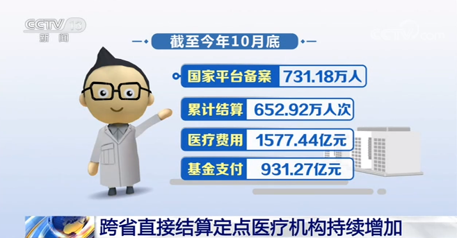 根据国家医保局公布的数据,截至今年10月底,全国住院费用跨省直接结算定点医疗机构数量为37938家,比上月增加1392家;国家平台备案731.18万人,累计结算652.92万人次,医疗费用1577.44亿元,基金支付931.27亿元。