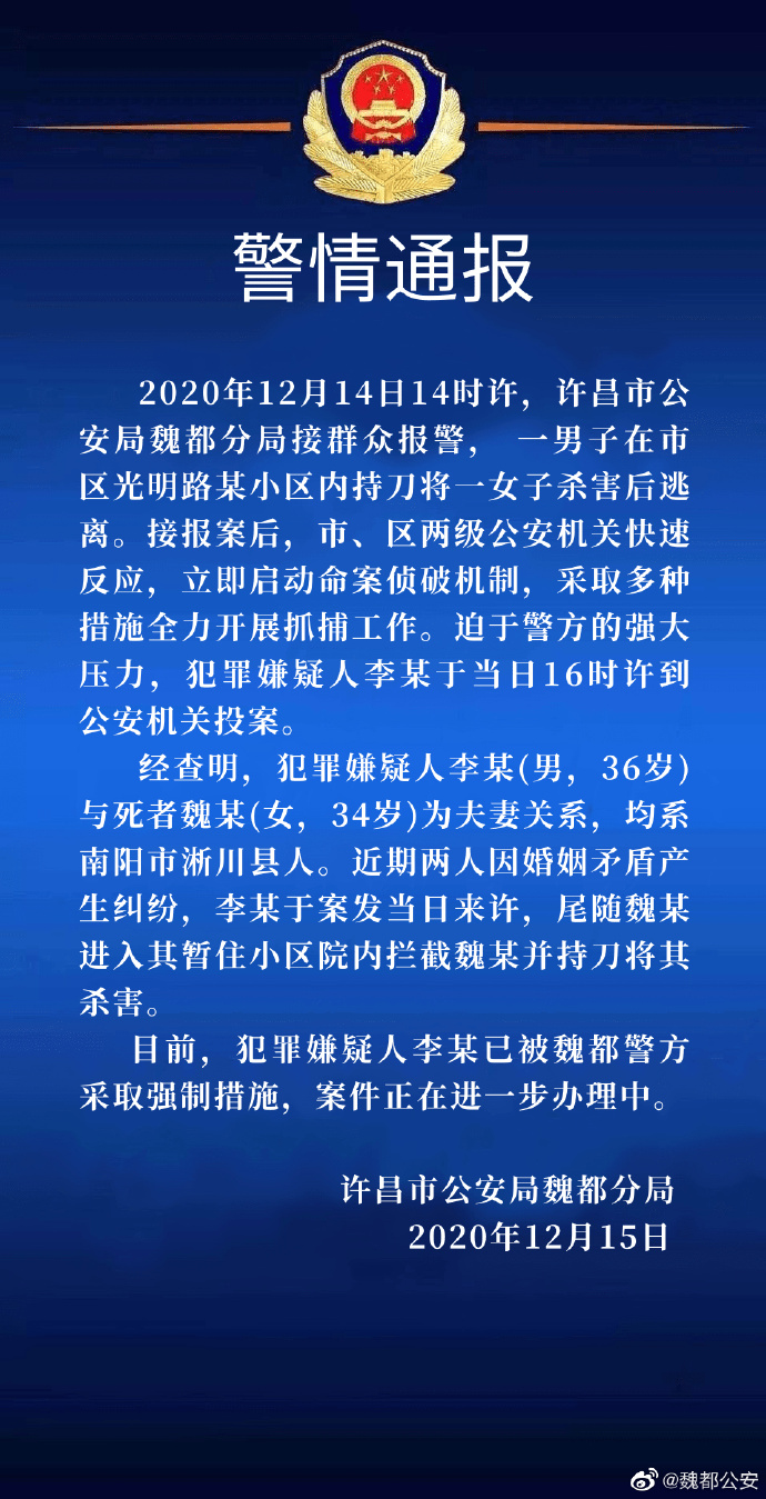据河南许昌@魏都公安 微博15日通报,12月14日14时许,许昌市公安局魏都分局接群众报警,一男子在市区光明路某小区内持刀将一女子杀害后逃离。接报案后,市、区两级公安机关快速反应,立即启动命案侦破机制,采取多种措施全力开展抓捕工作。迫于警方的强大压力,犯罪嫌疑人李某于当日16时许到公安机关投案。