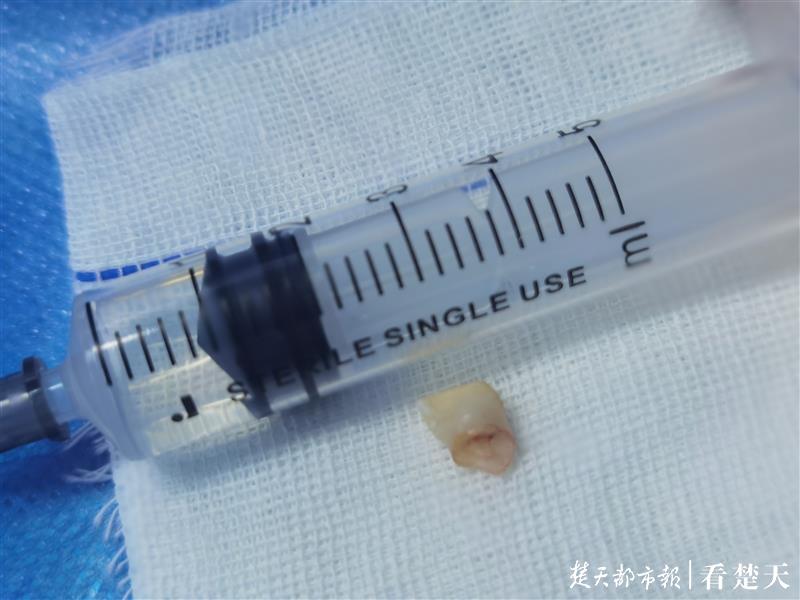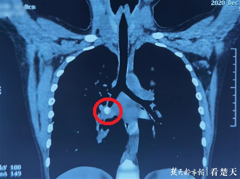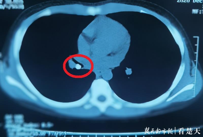 之后嘉嘉开始咳嗽,特别是放学路上跑几步,就咳得更厉害。在家附近医院查血象,显示炎症指数较高,连打了几天针也没见好。结合病史,医生推测很可能是牙齿呛咳进了气管,建议尽快转往武汉儿童医院。12月15日晚,一家人带着嘉嘉来到武汉儿童医院。