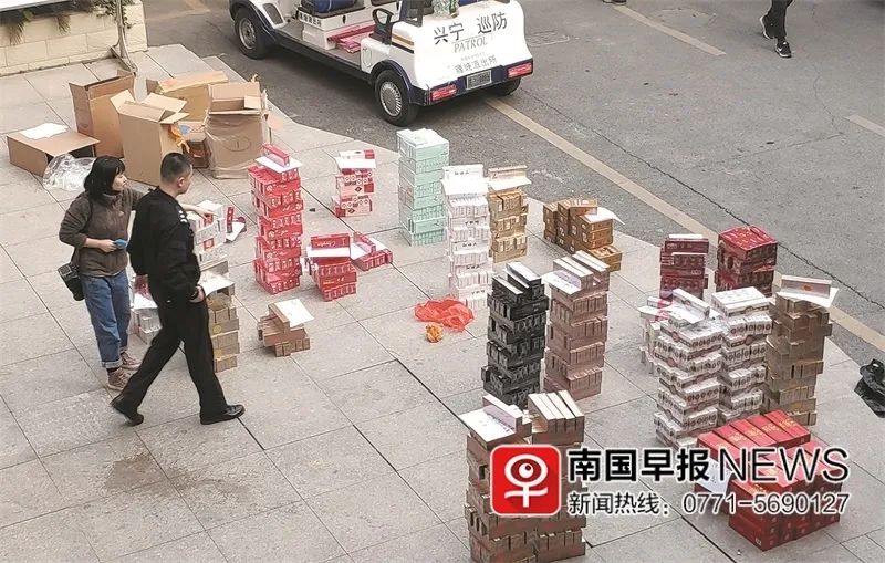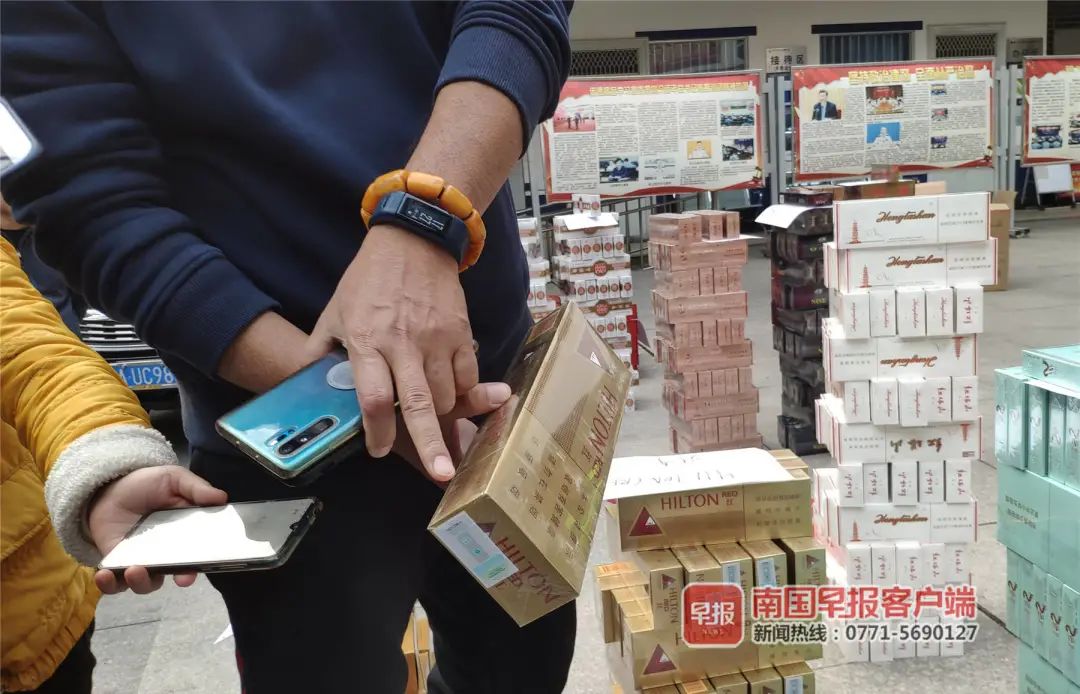1月4日上午10时许,兴宁警方和兴宁区烟草专卖局联合执法,在聚宝苑小区伏击守候。11 时许,一名男子驾驶一辆防城港牌照的小车出现在该小区,随后又发现一名中年女子驾驶一辆柳州牌照的车辆现身。两名嫌疑人出现在该小区后,并没有直接交易,而是兜兜转转查看现场是否安全,最后来到地下停车场进行交易。