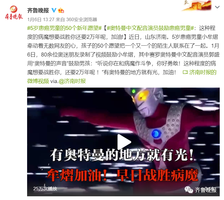 奥特曼中文配音演员也用声音鼓励患癌男童: