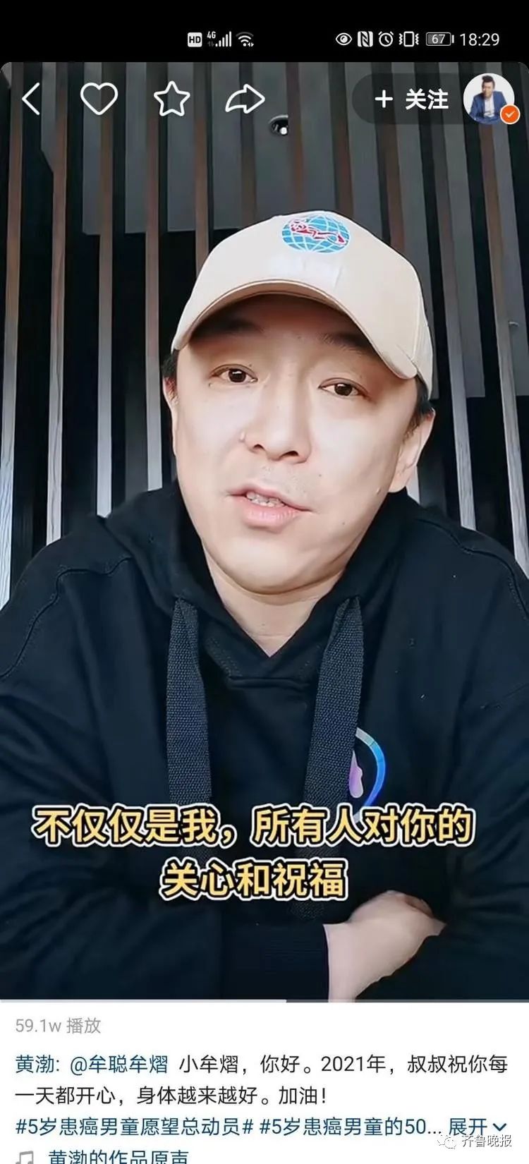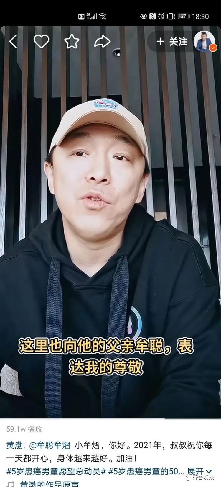 在视频中,黄渤说到,他最近收到了一个特别的来信,知道了一位含辛茹苦的父亲牟聪正带着孩子四处求医,十分辛苦,很不容易。他还特别提到看到了新年之际,小牟熠的50个愿望,其中有一个愿望就是希望见到他,“牟熠,你好,我们在这里用这样的方式见面了。因为疫情跟种种原因,我们只能这样相见。但是,我在这里给你送上的,不仅仅是我,(还有)所有人对你的关心和祝福。希望你能够早日康复。”