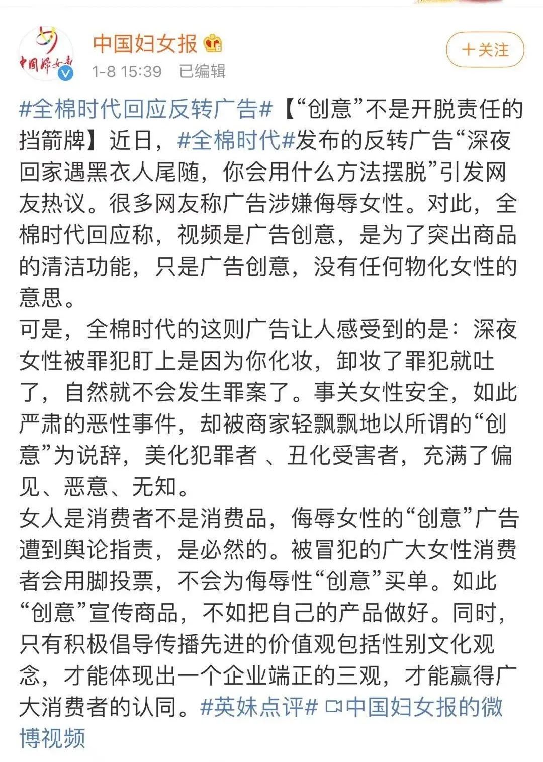1月8日,全国妇联机关报《中国妇女报》对此事评论称,“事关女性安全,如此严肃的恶性事件,却被商家轻飘飘地以所谓的‘创意’为说辞,美化犯罪者 、丑化受害者,充满了偏见、恶意、无知。女人是消费者不是消费品,侮辱女性的‘创意’广告遭到舆论指责,是必然的。被冒犯的广大女性消费者会用脚投票,不会为侮辱性‘创意’买单。”