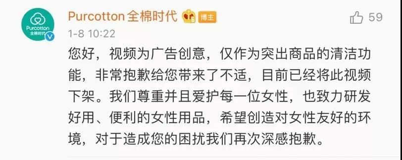 对此,全棉时代曾在其微博回应称,“视频为广告创意,仅作为突出商品的清洁功能,非常抱歉给您带来了不适,目前已经将此视频下架。我们尊重并且爱护每一位女性,也致力研发好用、便利的女性用品,希望创造对女性友好的环境,对于造成您的困扰我们再次深感抱歉。”