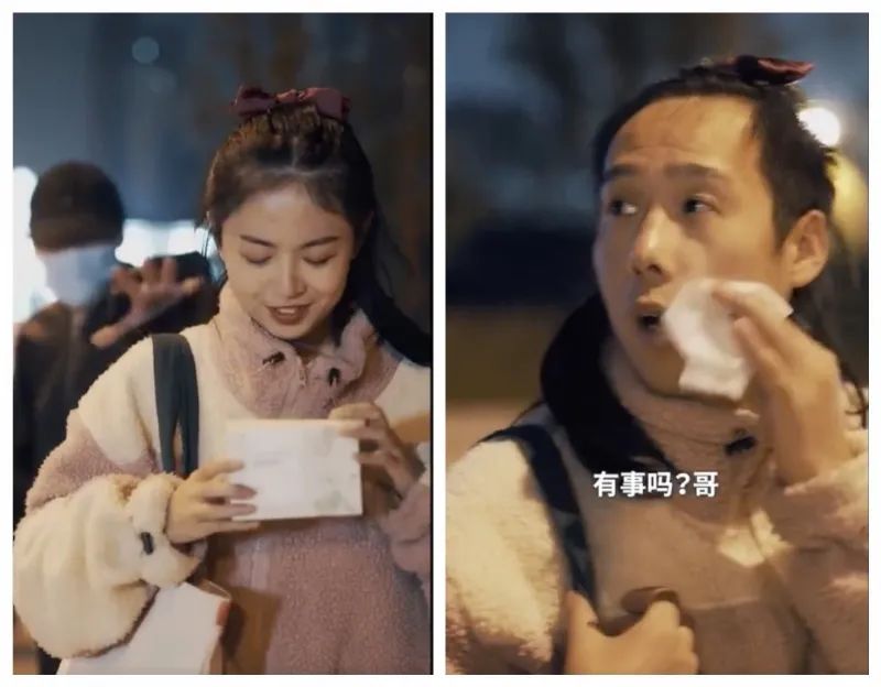 视频广告中,一名年轻漂亮的女子被一男子尾随跟踪,随后女子拿出全棉时代湿巾卸妆,变成一副男性面孔吓跑跟踪者。视频还配有跟踪者看到女子卸妆后素颜发出的呕吐音效,以及字幕“呕……”