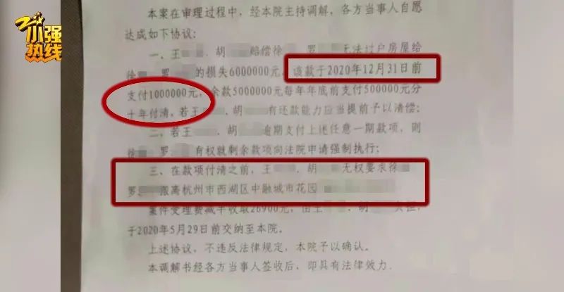 经过杭州西湖区人民法院调解,王女士和胡先生无法将房产过户给两位老人,造成的损失为600万。双方约定,在2020年12月31日前,支付100万,其余款项分10年付清。在款项付清之前,老人依旧可以居住在自己的房子里。可是,两位老人家至今都没有收到对方的还款,反而又收到了杭州上城区人民法院的执行裁决书。 裁定书上写明,由于王女士无法偿还邮政银行的400多万贷款,被银行告上法院,现在强制执行查封其名下资产。