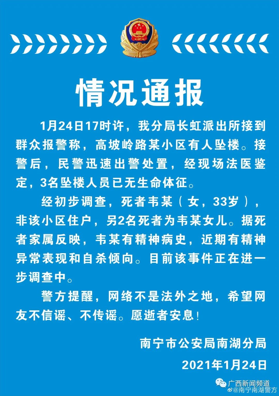 南宁南湖警方官方微博发布情况通报↓↓↓