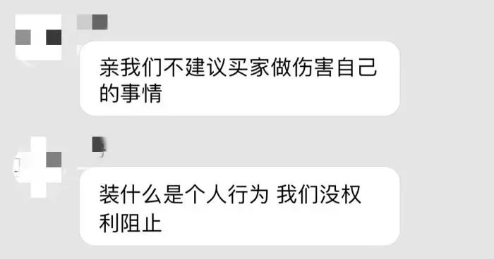 当记者再度追问是否可用来装血时,卖家回复称:“亲,我们不建议买家做伤害自己的事情。装什么是个人行为,我们没权利(力)阻止。”
