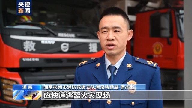 湖南郴州市消防救援支队涌泉特勤站站长 曾杰毅:当家里发生火灾时,在烟气还没有蔓延过来的时候,应快速跑离火灾现场。而如果是高层,尤其家中重要出口附近发生火灾时,不仅温度高,浓烟阻挡视线,也易吸入有毒烟气,这时盲目冒险穿越浓烟非常危险。可以进入通风的房间,关上大门隔绝高温和浓烟,拨打119报告自己被困的准确位置,等待救援。