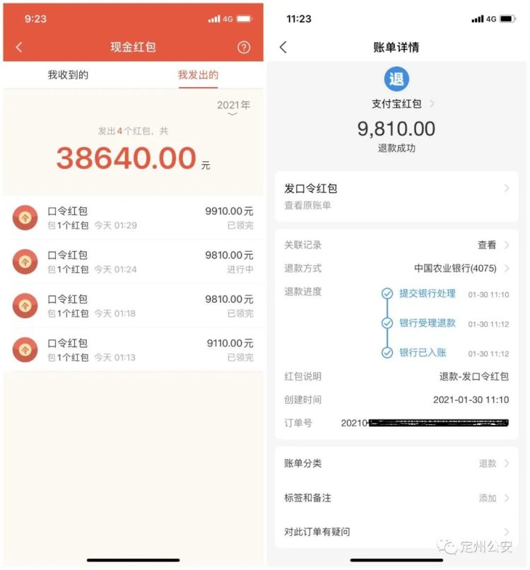 东亭刑警中队民警在了解案情后,查看该4笔口令红包中尚有一笔处于领取中。随后民警及时与定州市反诈中心进行沟通,第一时间对该交易止付未果后,又多次与支付宝客服进行沟通、说明,支付宝客服在了解情况后,及时将该交易终止。目前该笔口令红包的9810元已返回被害人张某明银行卡中,受害人张某明对民警及时帮其挽回部分被骗钱款由衷表示感谢。
