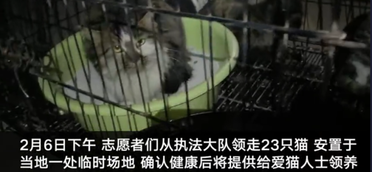 事件曝光后,新田县农业农村局从市场带回32只活猫,其中23只于6日下午被当地志愿者们领走,安置于一处临时场地,等待爱心人士领养。