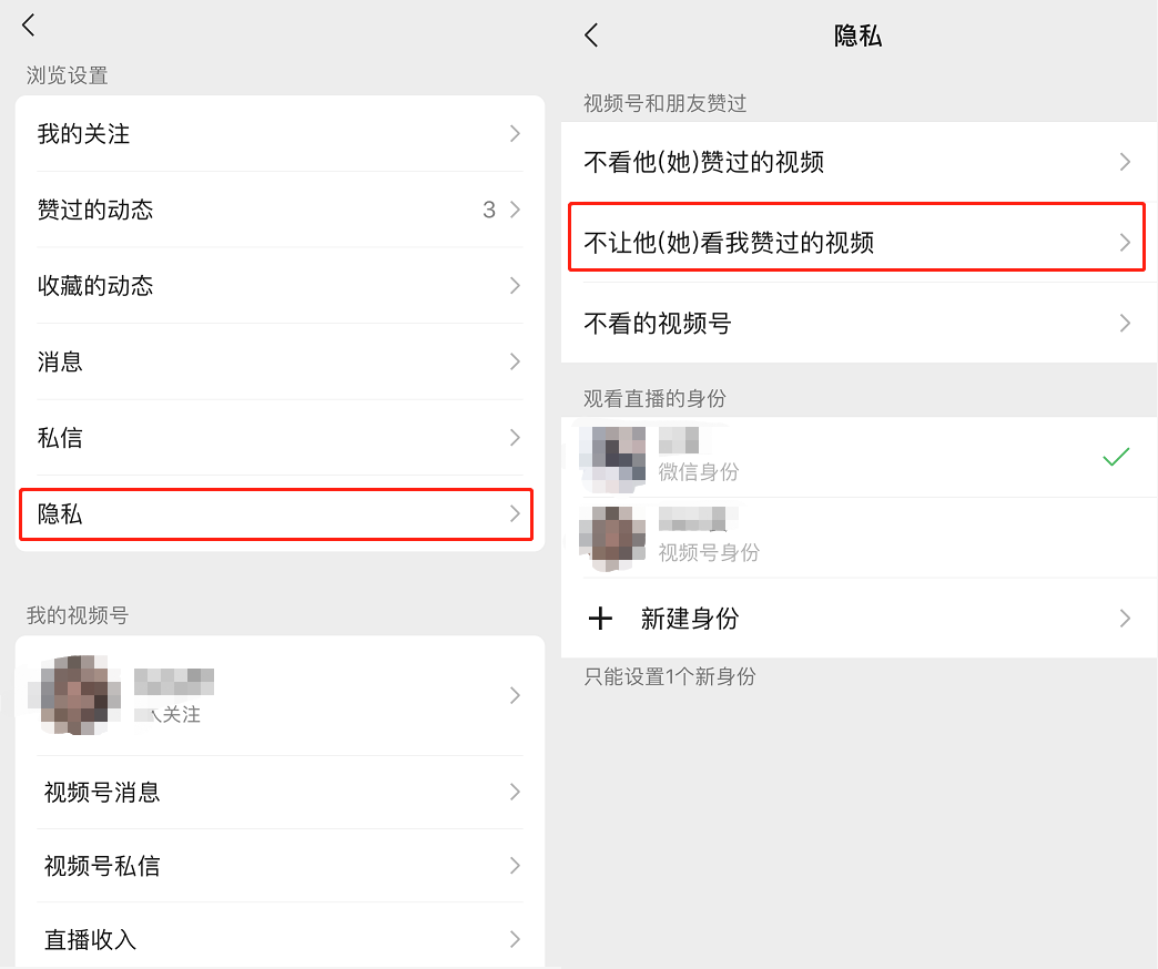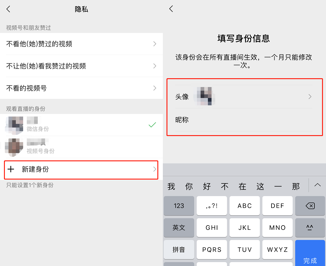 类似于子账号功能一样,点击视频号—右上角“浏览设置”后进入“隐私”,可“新建身份”,点击上传头像,填写昵称即可。需要注意的是:新建身份会在所有直播间生效,一个月只能修改一次。