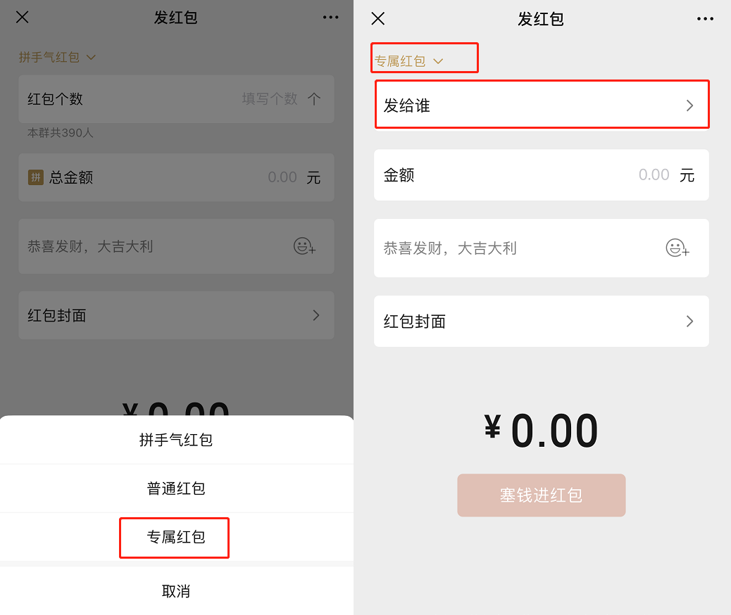 在8.0版本中,灰度测试的专属群聊红包,已经在本次微信更新中正式上线了。在微信群内选择发红包,点击“拼手气红包”字样选择“专属红包” ,选择红包发送群内的某个成员,发送出去后,专属领取红包的群成员会在群名称看到微信红包强提醒。