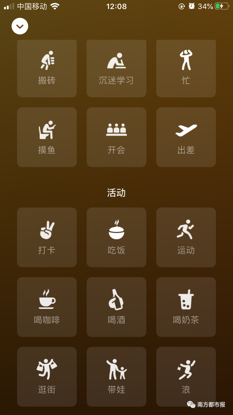 同时,新增了几种新状态,比如:“胡思乱想、沉迷学习、开会、出差、睡觉”等。